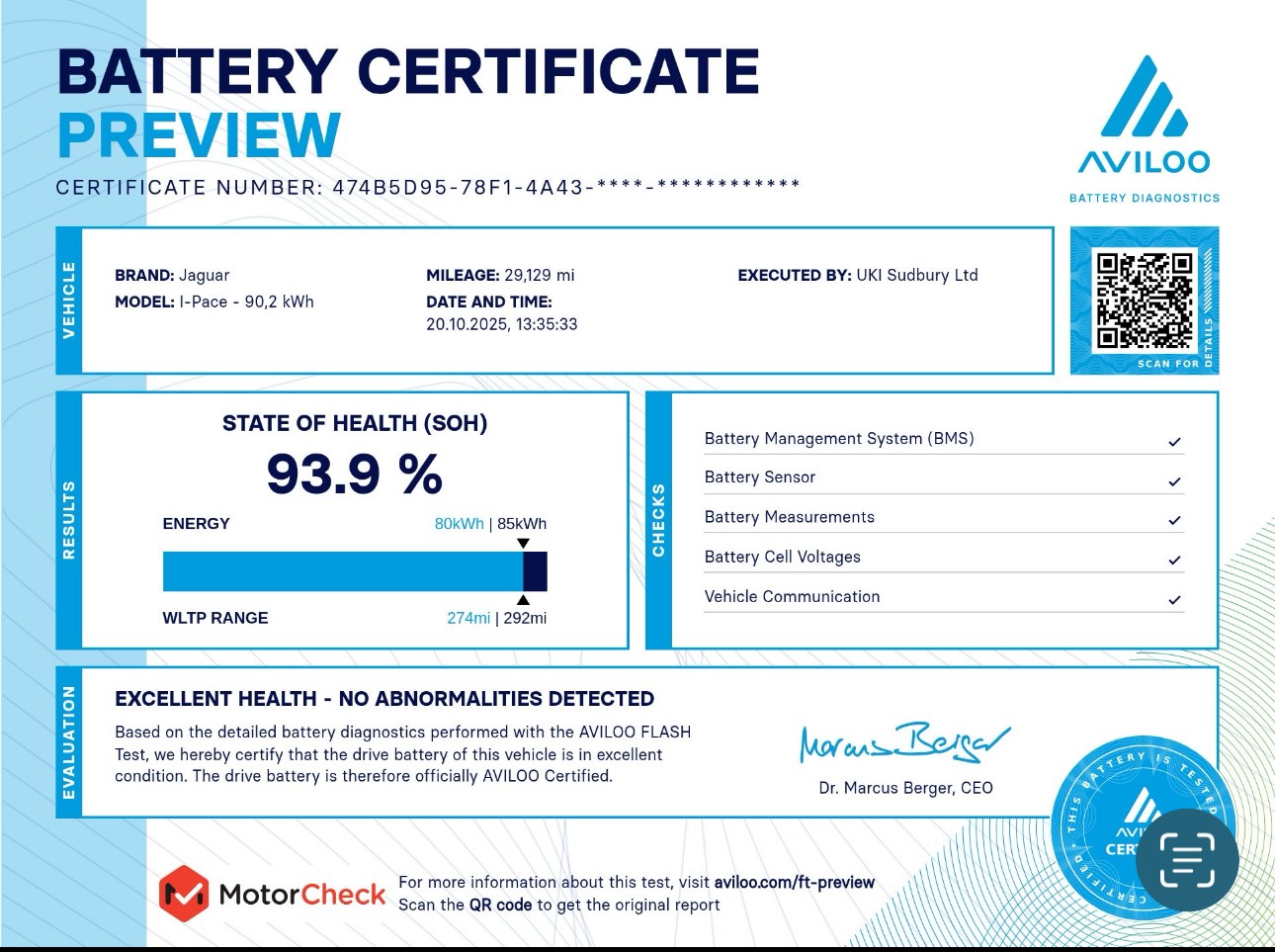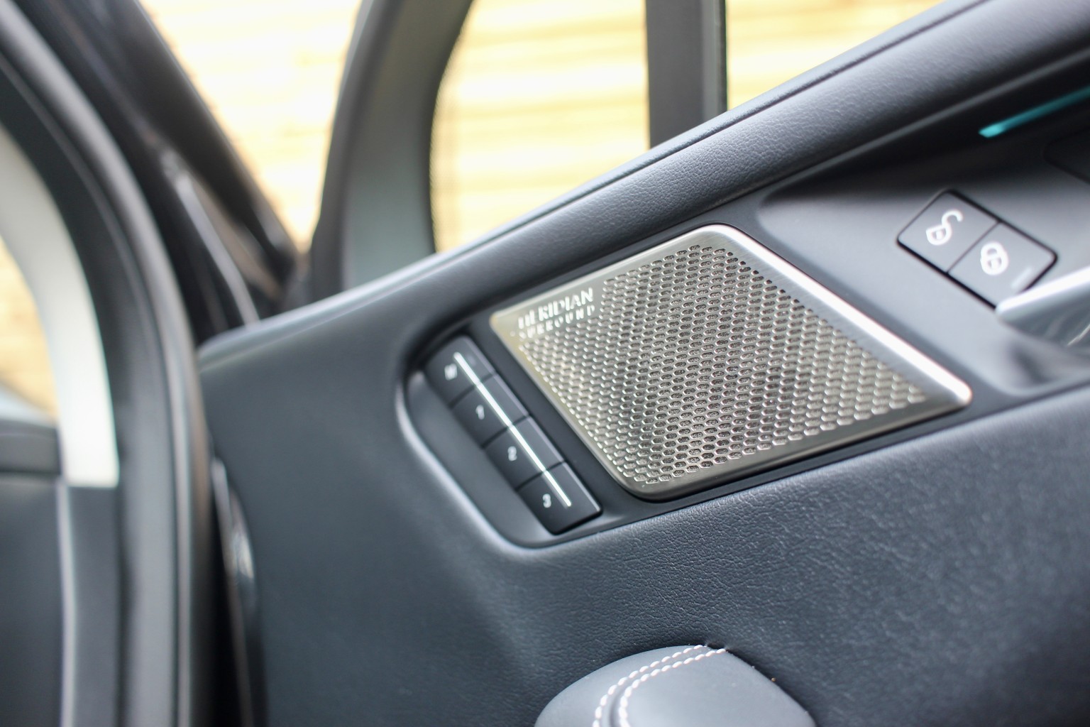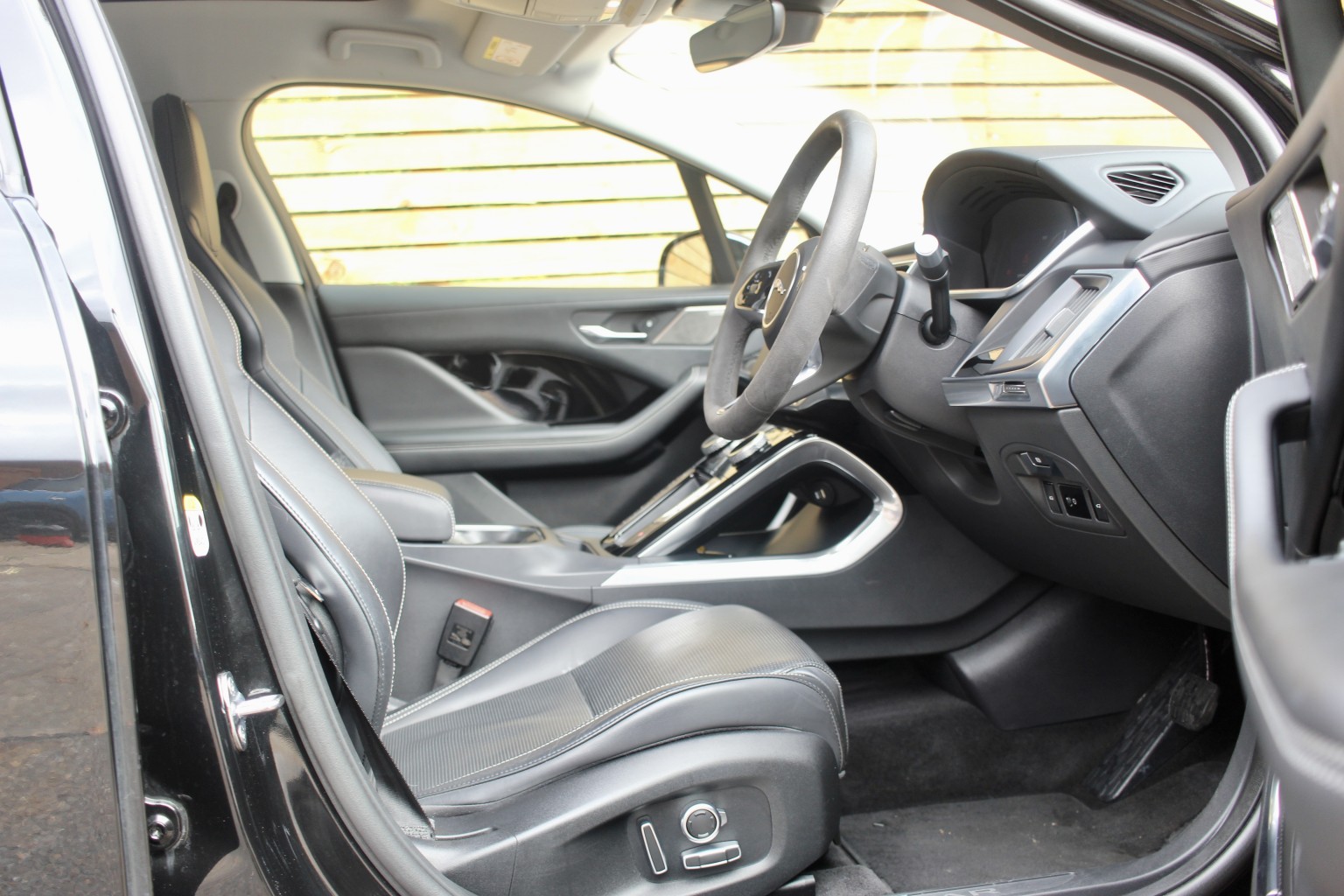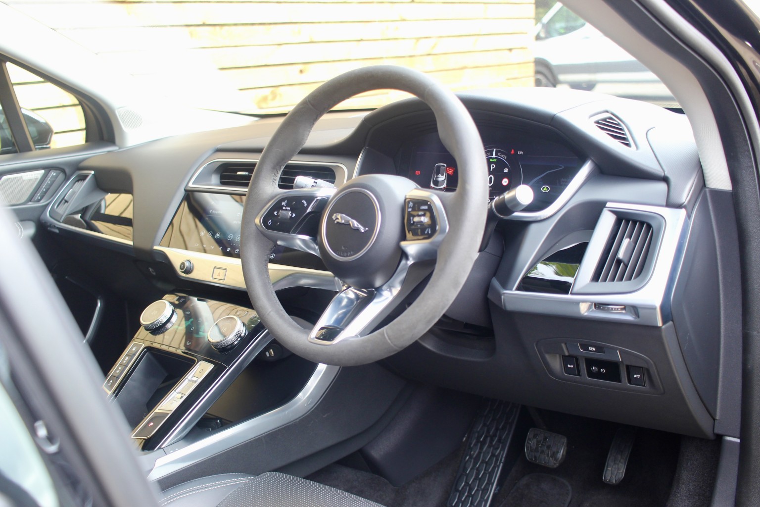 There is a huge specification on this I Pace which includes - Panoramic sunroof, 22" multi spoke alloy wheels, Full black leather performance seats, 14 way Heated and cooled electric memory front seats, Heated rear seats, Privacy glass, Reduced spare wheel, Twin front cup holders with cover, Santorini black metallic paint, Electronic air suspension, Comfort access, LED headlights with automatic high beam assist, Automatic lights and wipers, Satellite navigation, Bluetooth telephone and media, DAB radio, Apple CarPlay, 360 Cameras, Electric folding door mirrors, Electric tailgate, Blind spot assist, Lane keeping assist, Adaptive cruise control, Suede steering wheel, Front and rear parking sensors, Park assist, Meridian surround sound, Heated front windscreen.