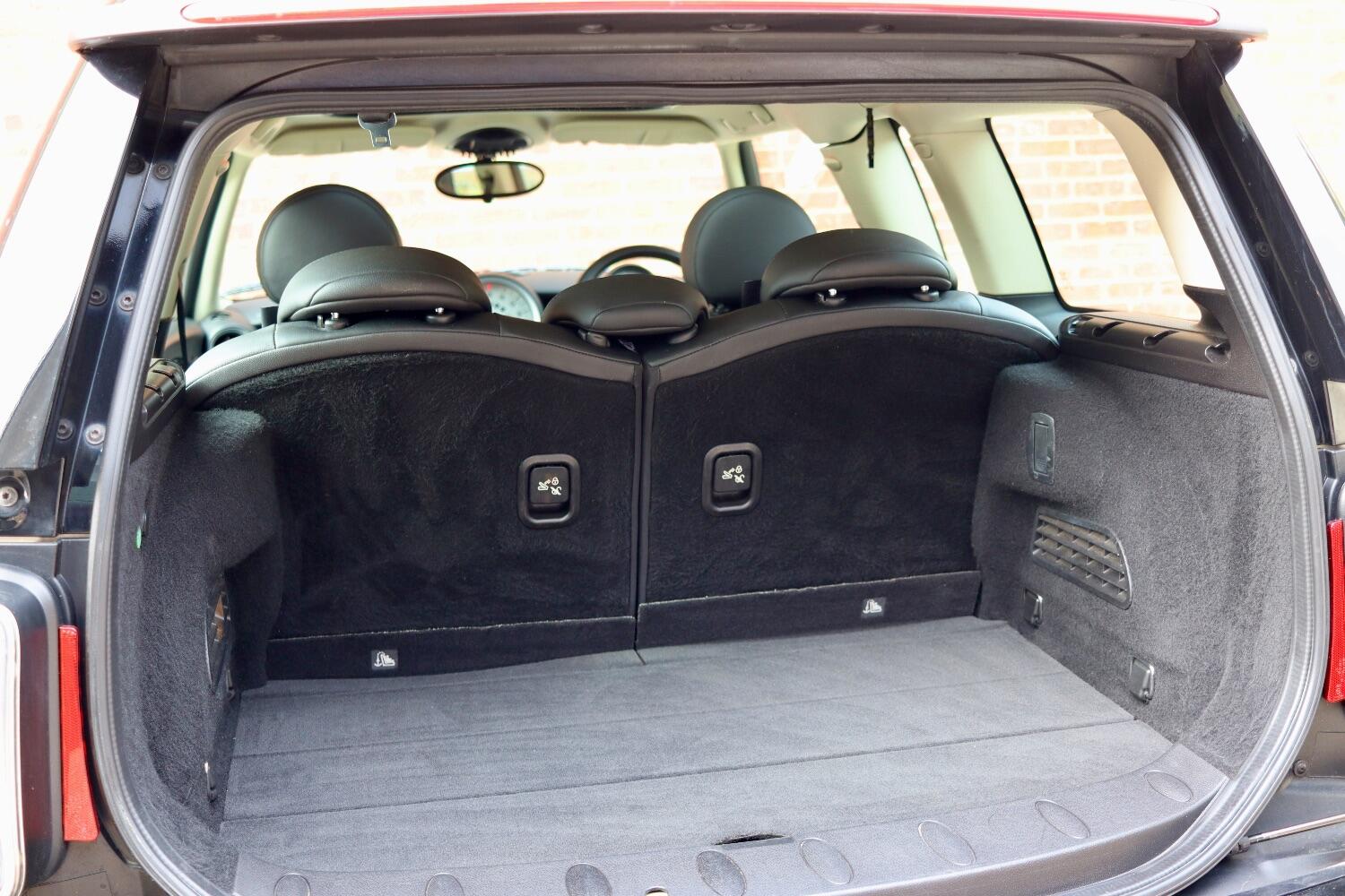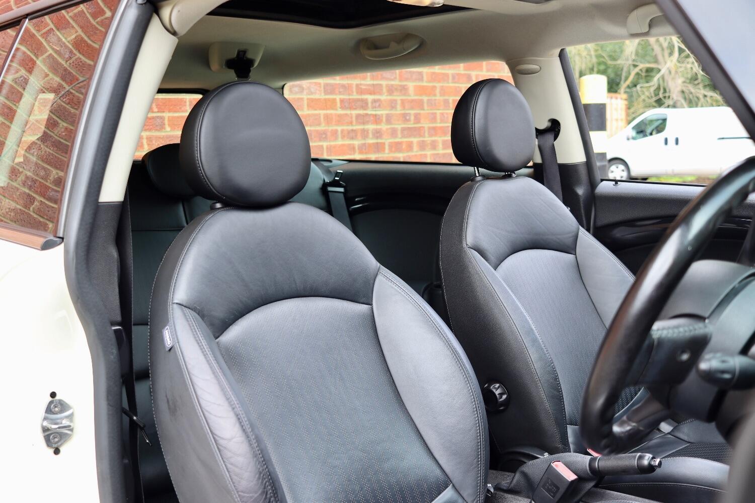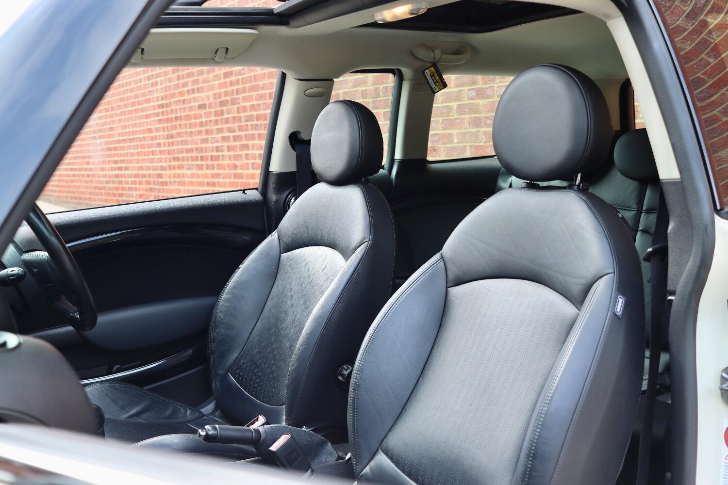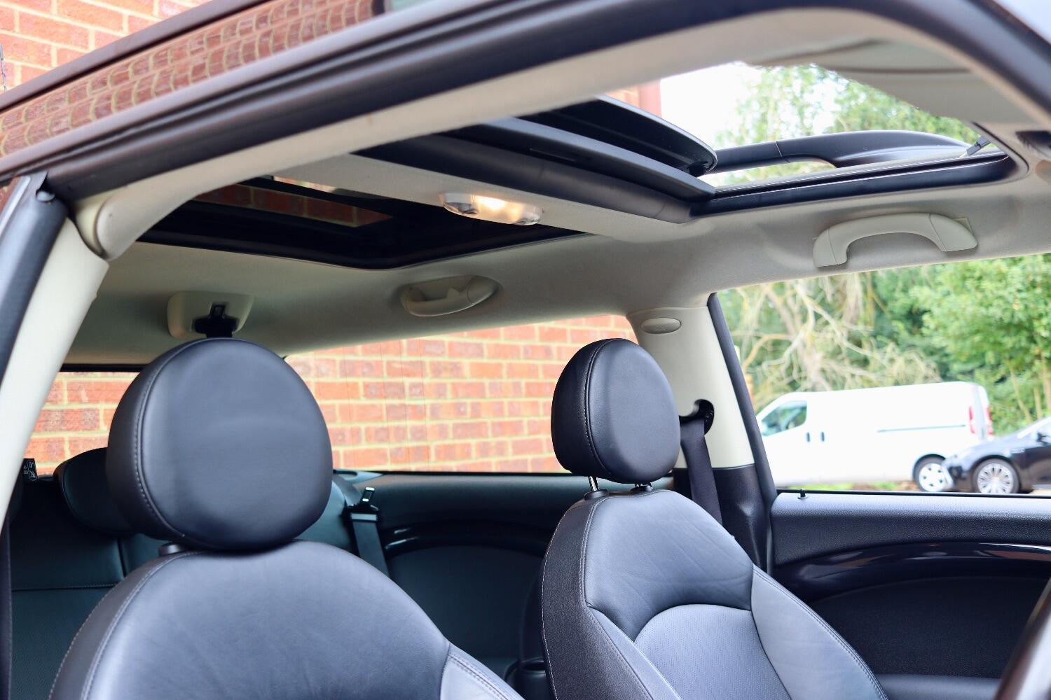 There is a great specification on this Clubman which includes - Electric slide/tilt panoramic sunroof, Full black leather sports seats, Heated front seats, Front fog lights, Black bonnet stripes, Pepper white, Black roof and mirror caps, 16" 6 double spoke alloy wheels in silver, Gloss black interior trim, Chilli pack, Ambient lighting, 3 Spoke leather steering wheel, Cruise control, Automatic lights and wipers, Automatic air conditioning, USB/Aux input, Bluetooth telephone, DAB radio, Rear parking sensors.