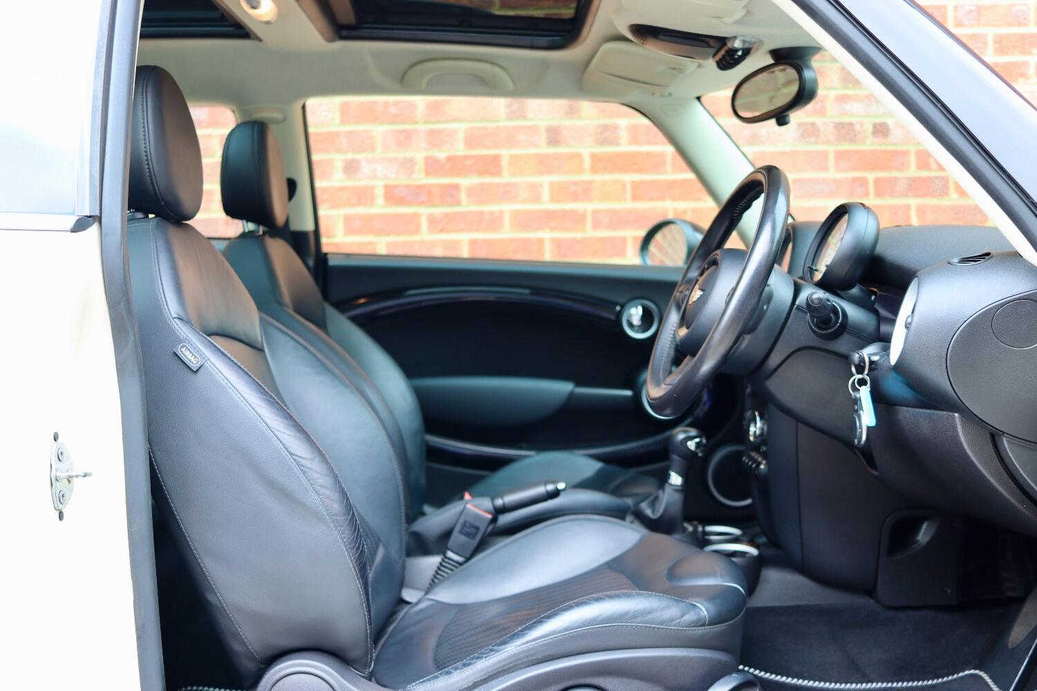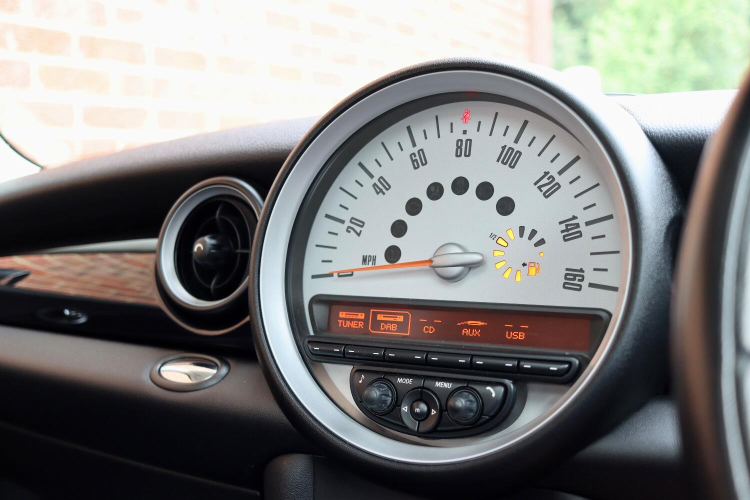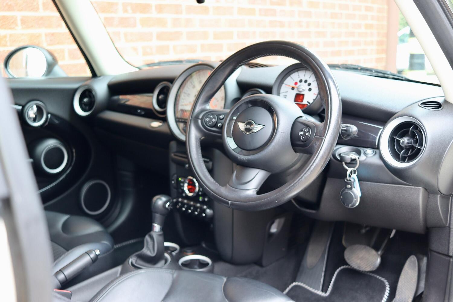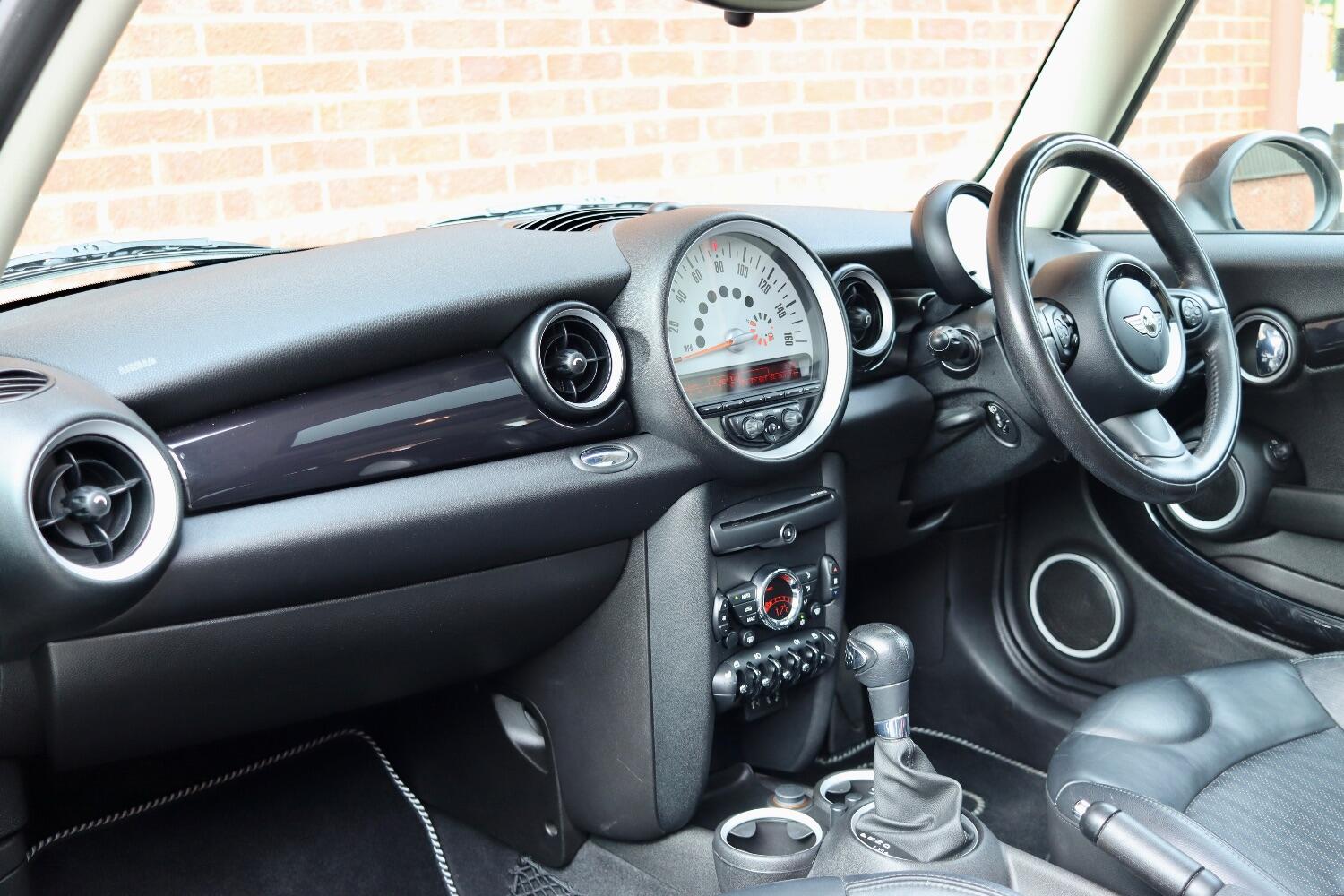 There is a great specification on this Clubman which includes - Electric slide/tilt panoramic sunroof, Full black leather sports seats, Heated front seats, Front fog lights, Black bonnet stripes, Pepper white, Black roof and mirror caps, 16" 6 double spoke alloy wheels in silver, Gloss black interior trim, Chilli pack, Ambient lighting, 3 Spoke leather steering wheel, Cruise control, Automatic lights and wipers, Automatic air conditioning, USB/Aux input, Bluetooth telephone, DAB radio, Rear parking sensors.