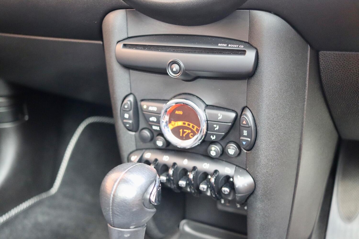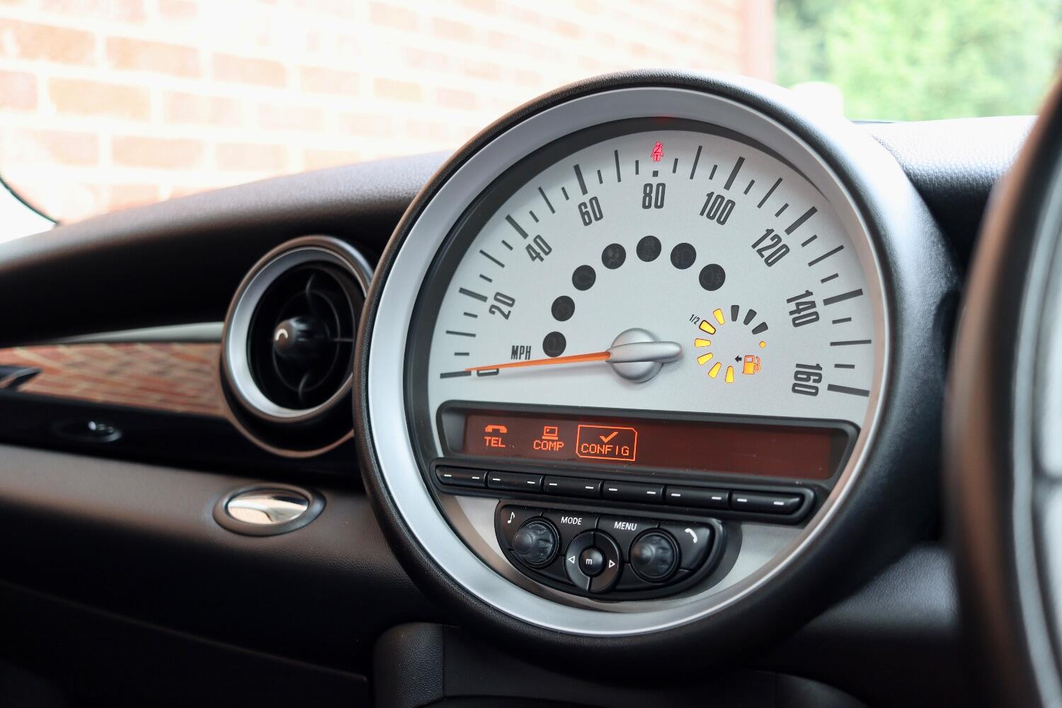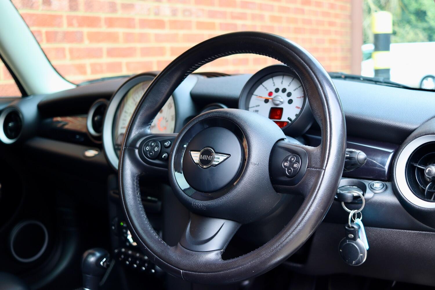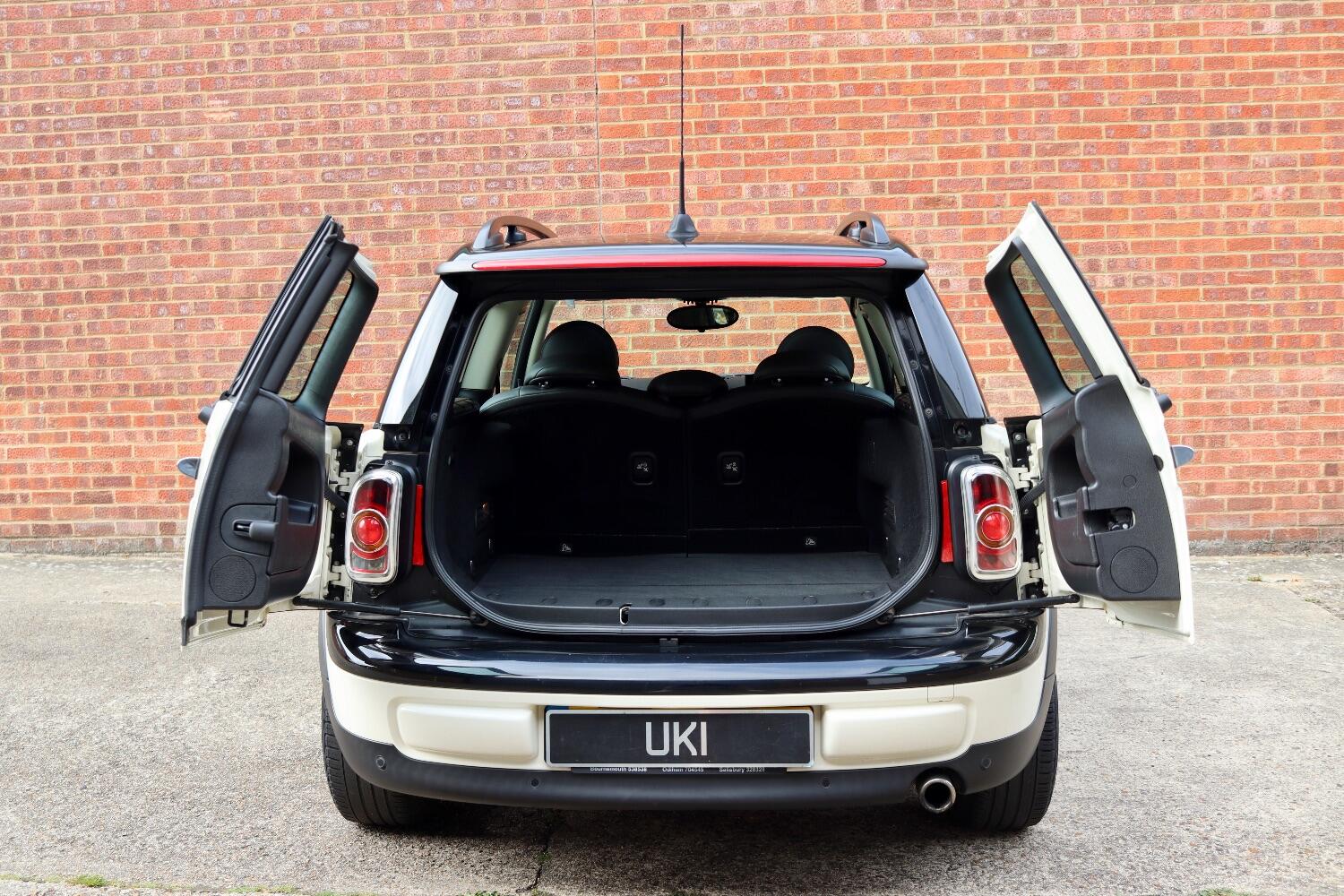 There is a great specification on this Clubman which includes - Electric slide/tilt panoramic sunroof, Full black leather sports seats, Heated front seats, Front fog lights, Black bonnet stripes, Pepper white, Black roof and mirror caps, 16" 6 double spoke alloy wheels in silver, Gloss black interior trim, Chilli pack, Ambient lighting, 3 Spoke leather steering wheel, Cruise control, Automatic lights and wipers, Automatic air conditioning, USB/Aux input, Bluetooth telephone, DAB radio, Rear parking sensors.