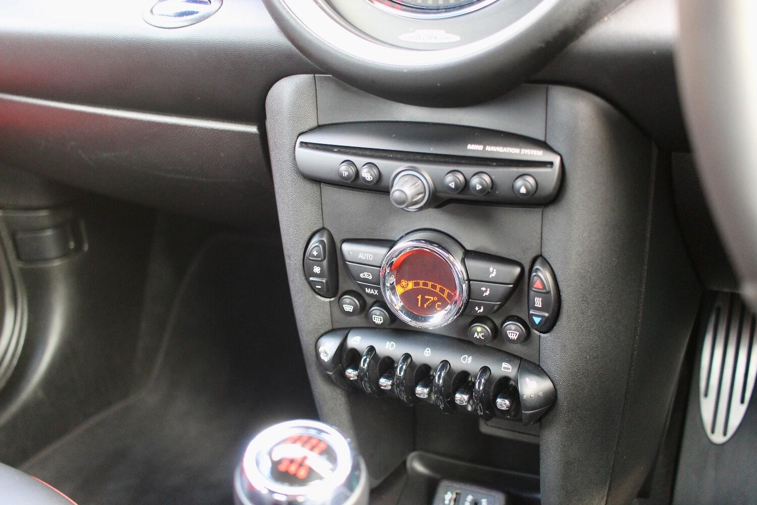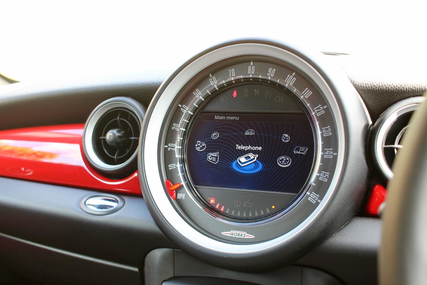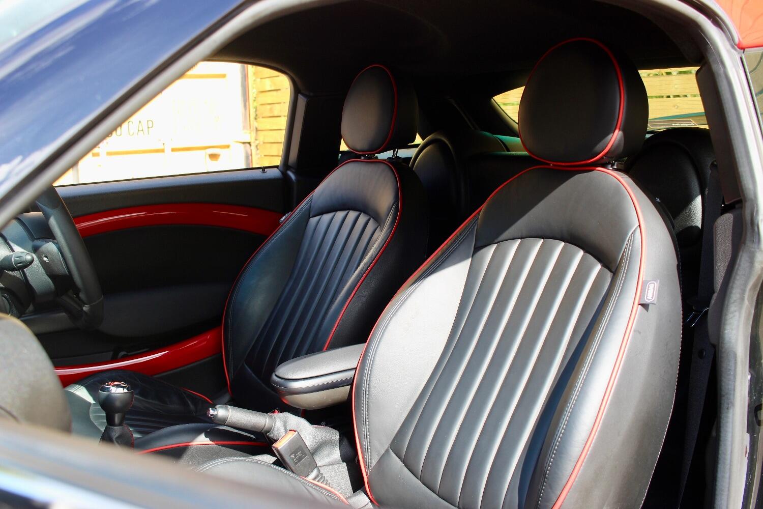 There is a fantastic specification on this Mini Coupe which includes - Media pack, Satellite navigation, Bluetooth telephone and media, DAB radio, Full black with championship red lounge leather sports seats, Heated seats, Automatic lights and wipers, Automatic air conditioning, Heated front windscreen, Rear parking sensors, Midnight black metallic paint, 17" multi spoke alloy wheels in silver, Bi-xenon headlights, Black headlight reflectors, LED front fog lights, Centre armrest, Darkened rear glass, Ambient lighting, Cruise control.