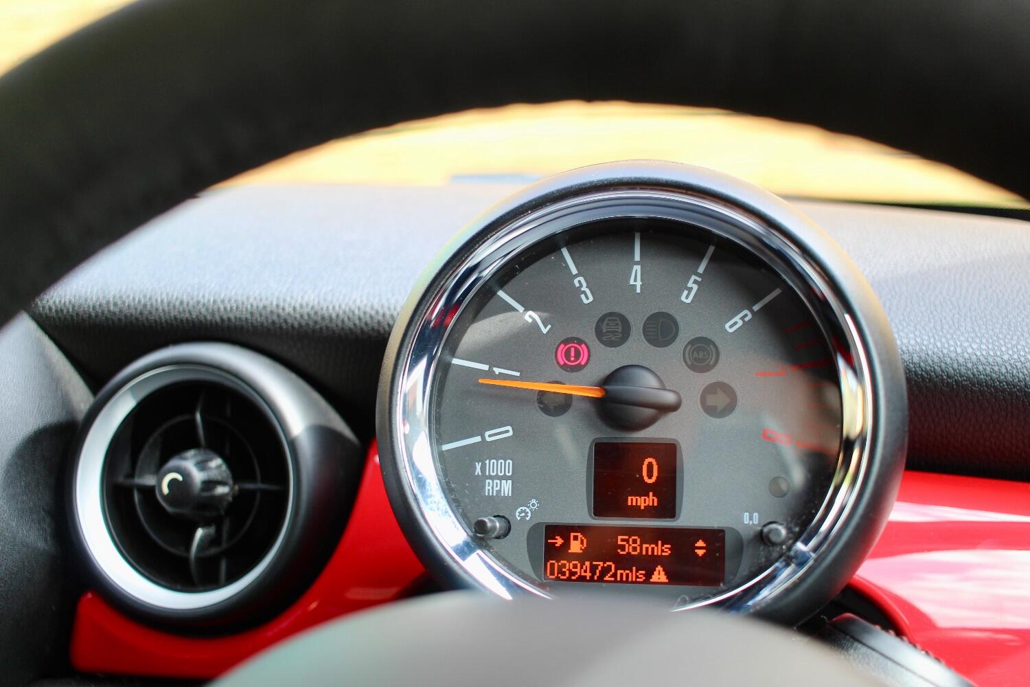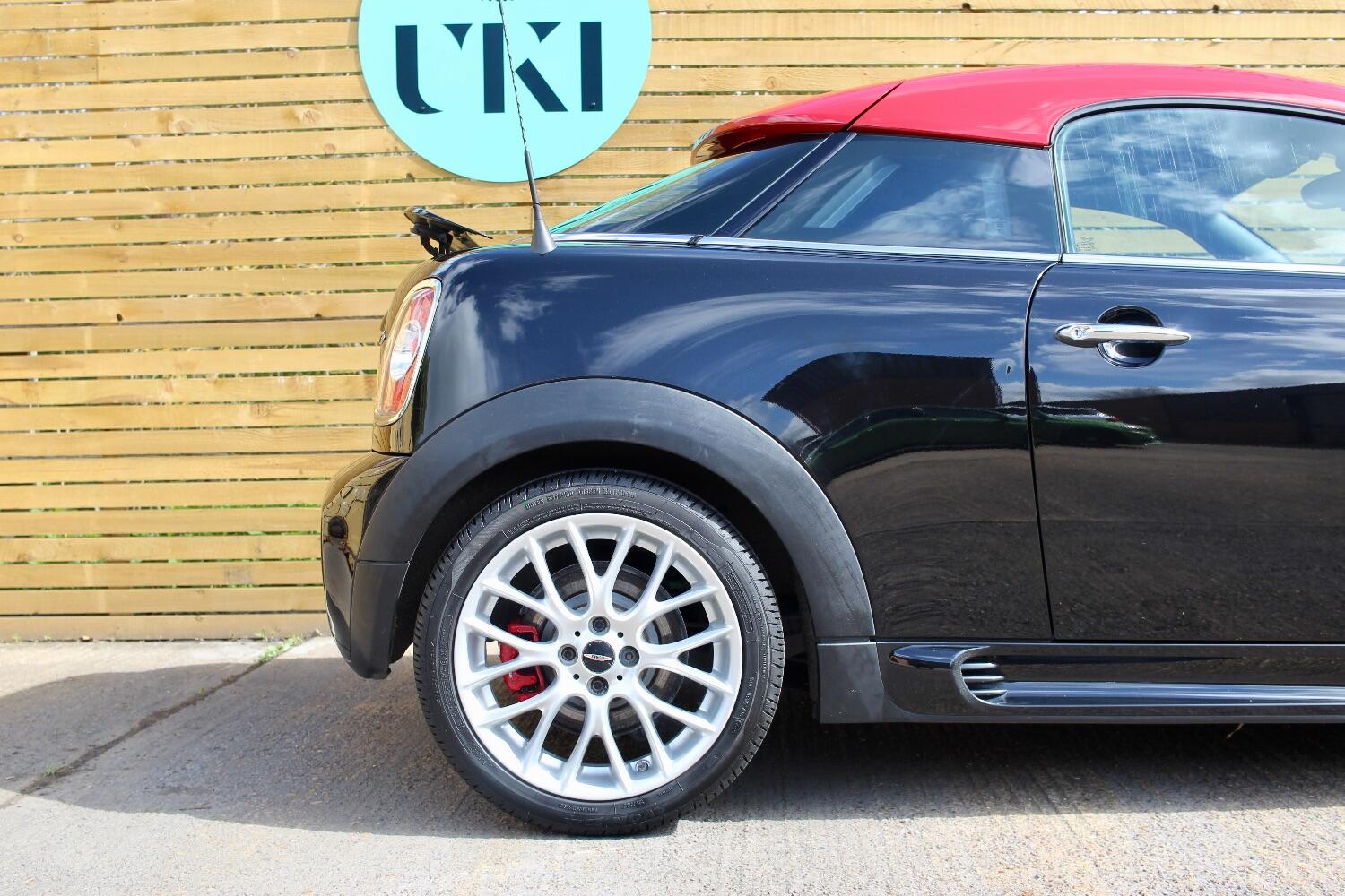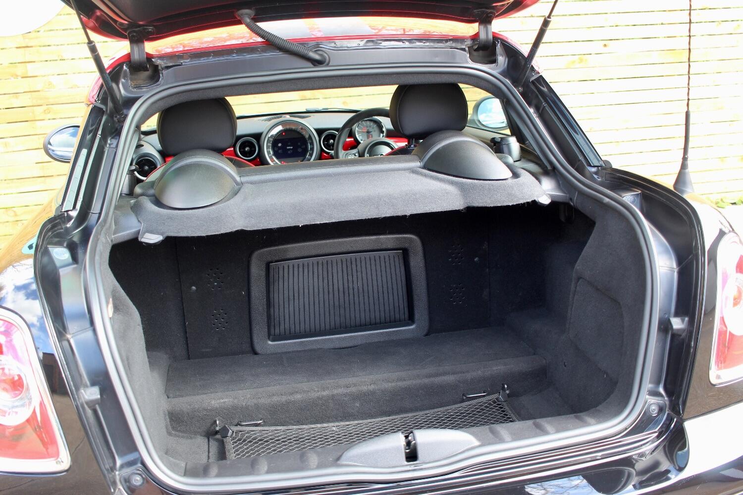 There is a fantastic specification on this Mini Coupe which includes - Media pack, Satellite navigation, Bluetooth telephone and media, DAB radio, Full black with championship red lounge leather sports seats, Heated seats, Automatic lights and wipers, Automatic air conditioning, Heated front windscreen, Rear parking sensors, Midnight black metallic paint, 17" multi spoke alloy wheels in silver, Bi-xenon headlights, Black headlight reflectors, LED front fog lights, Centre armrest, Darkened rear glass, Ambient lighting, Cruise control.