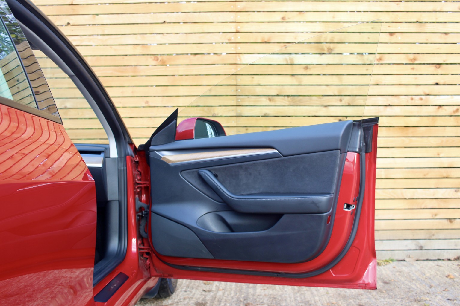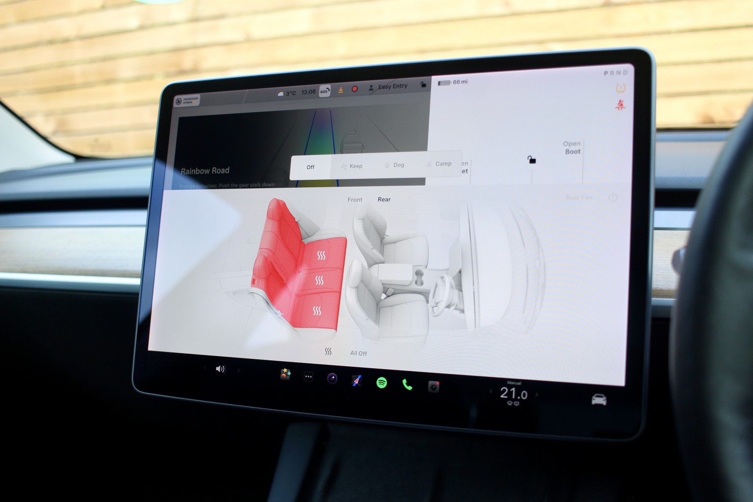 There is a great specification on this Model 3 which includes - Red multi coat paintwork, Panoramic roof, Leather upholstery, Electric seats with memory, Satellite navigation, Bluetooth telephone and media, DAB radio, Premium audio, Heated front seats, Heated rear seats, Heated front windscreen, Heated steering wheel, Electric tailgate, USB, Wireless charging, Automatic lights and wipers, Automatic high beam assist, Adaptive headlights, Autopilot, Reverse camera, 18" Aero wheels, Keyless entry, Sentry mode.